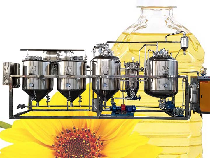 La planta de refinado de aceite de girasol elimina impurezas nocivas y sustancias inútiles, como proteínas, fosfolípidos, pigmentos, humedad, ceras y otras impurezas. Y entonces el aceite de girasol refinado puede alcanzar el estándar de los alimentos y el almacenamiento.
